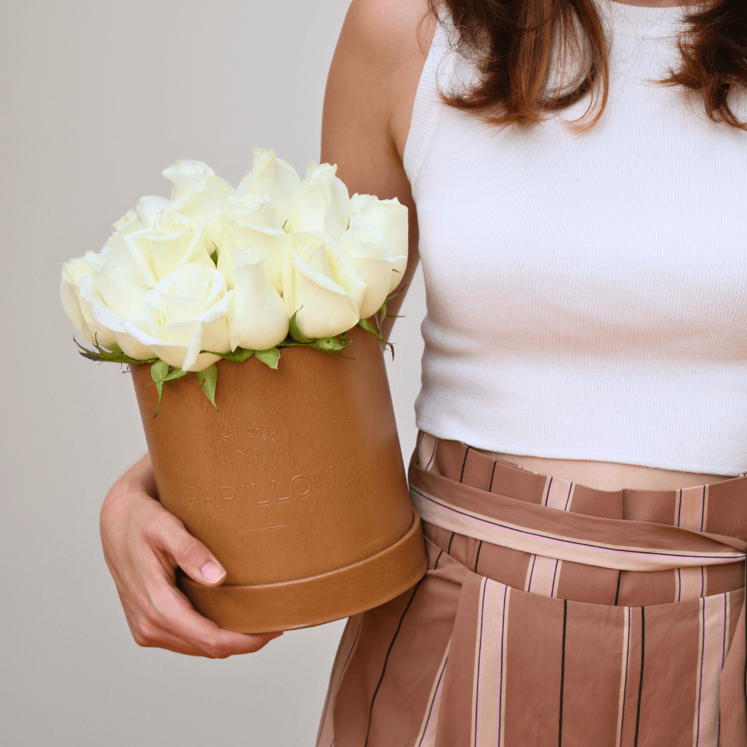 Nuestro Hat Box de rosas blancas combina la pureza de las rosas en un arreglo compacto y elegante. Perfecto para expresar amor, gratitud o felicitaciones en cualquier ocasión especial.