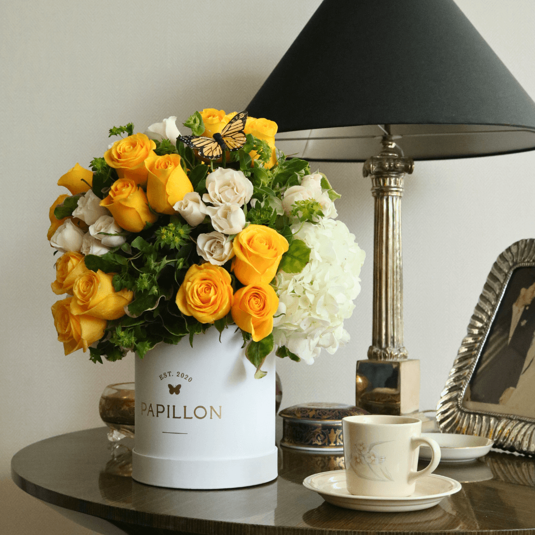 El Hatbox Sicilia combina la alegría de las rosas amarillas, la delicadeza de las mini rosas blancas, la suavidad de las hortensias blancas y la frescura del follaje en un arreglo mediano lleno de optimismo. Perfecto para celebrar momentos felices y llenos de luz.
