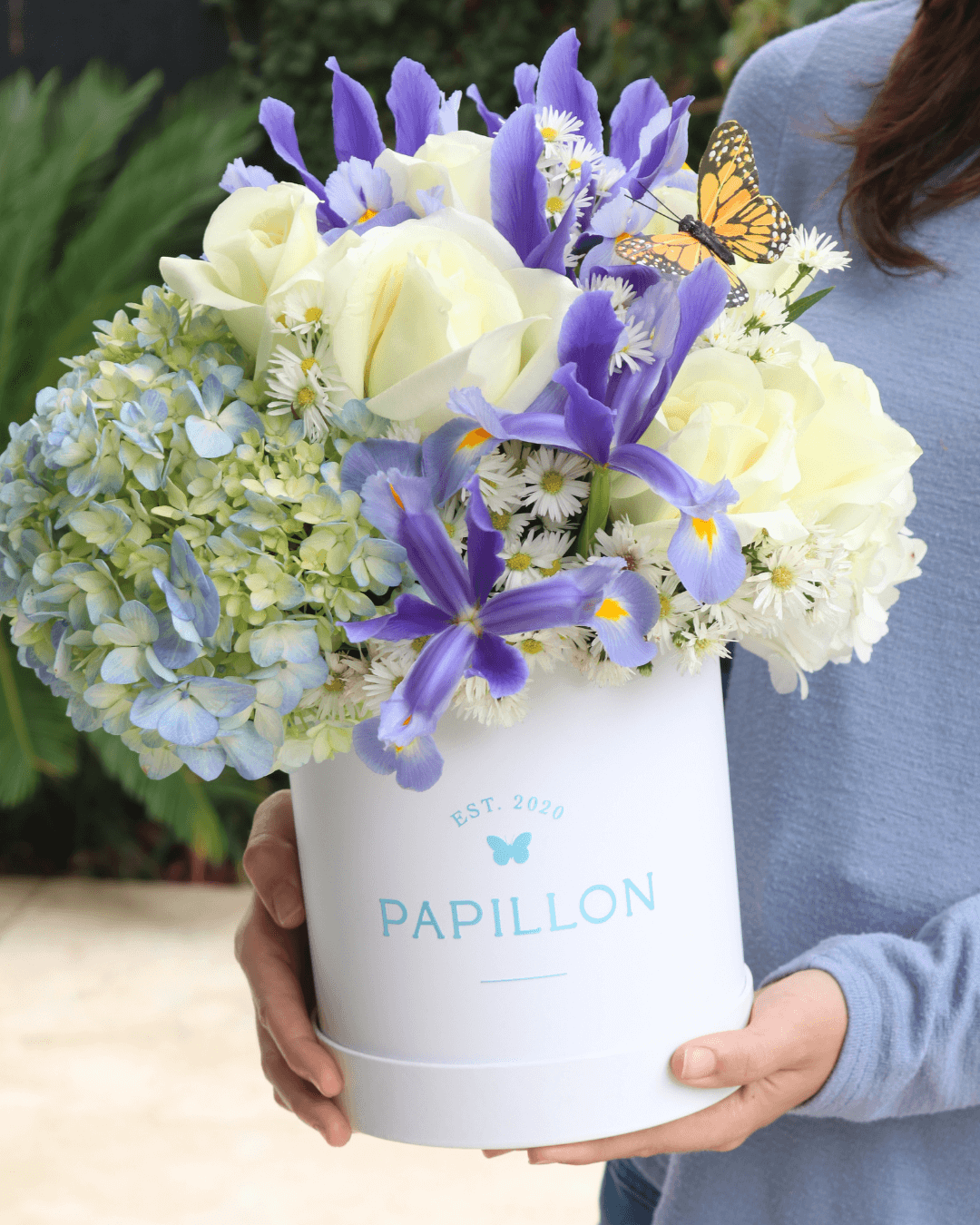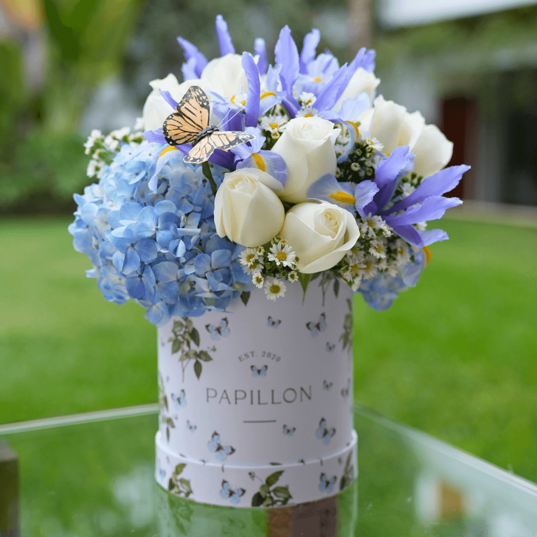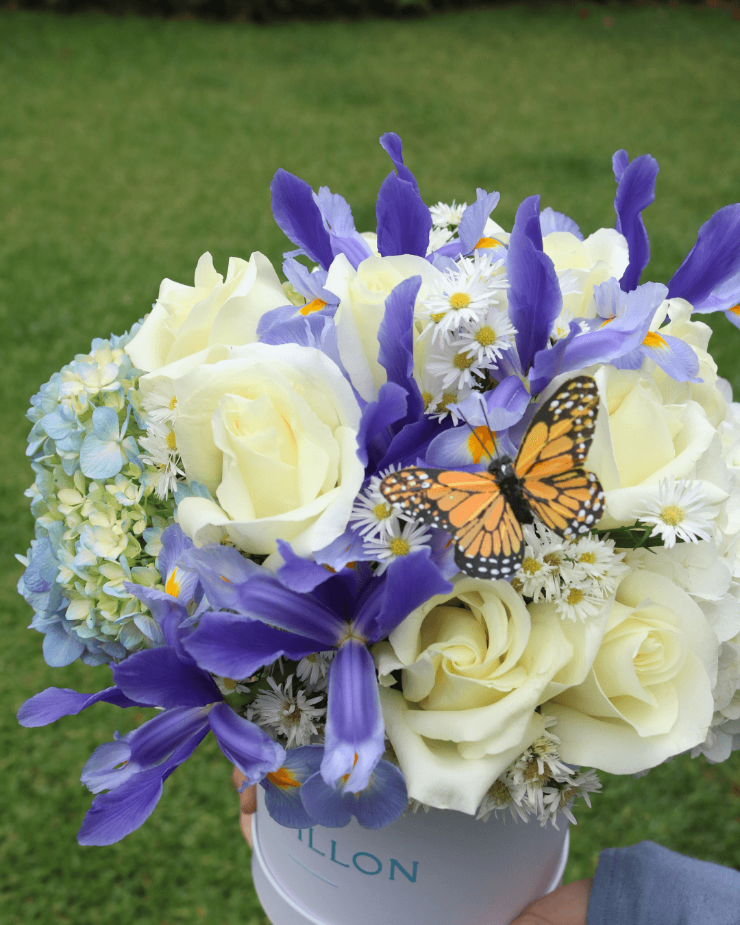 Este mágico Hatbox Tobi combina la pureza de las rosas blancas, la tranquilidad de las hortensias celestes y blancas, la elegancia de los iris y la gracia de las astromelias en un arreglo mediano lleno de encanto. Perfecto para expresar admiración, esperanza y amor duradero.
